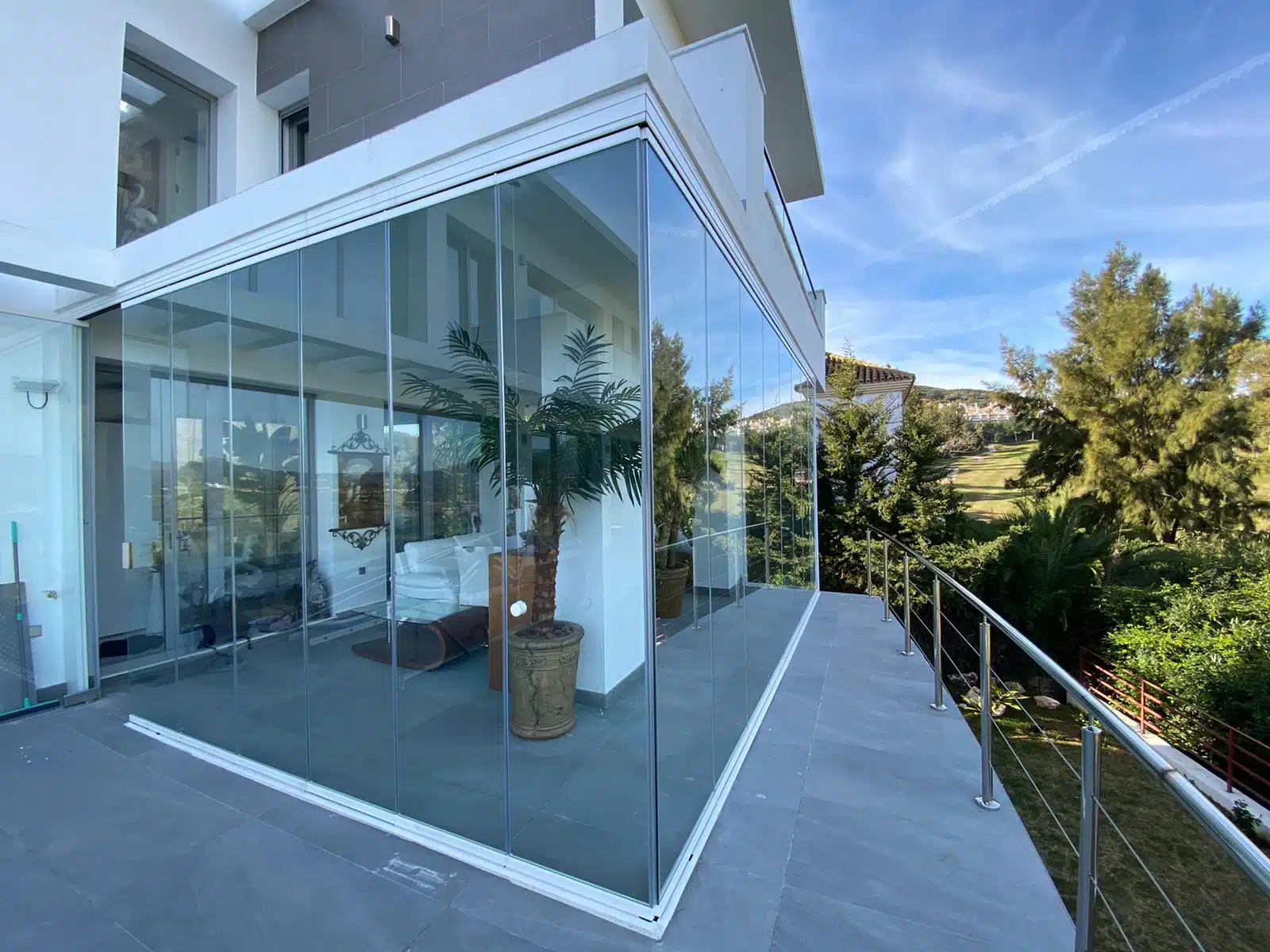 El cristal, especialmente en sistemas de cortinas de cristal sin perfiles verticales, es la mejor opción para disfrutar de vistas panorámicas despejadas y máxima entrada de luz natural.