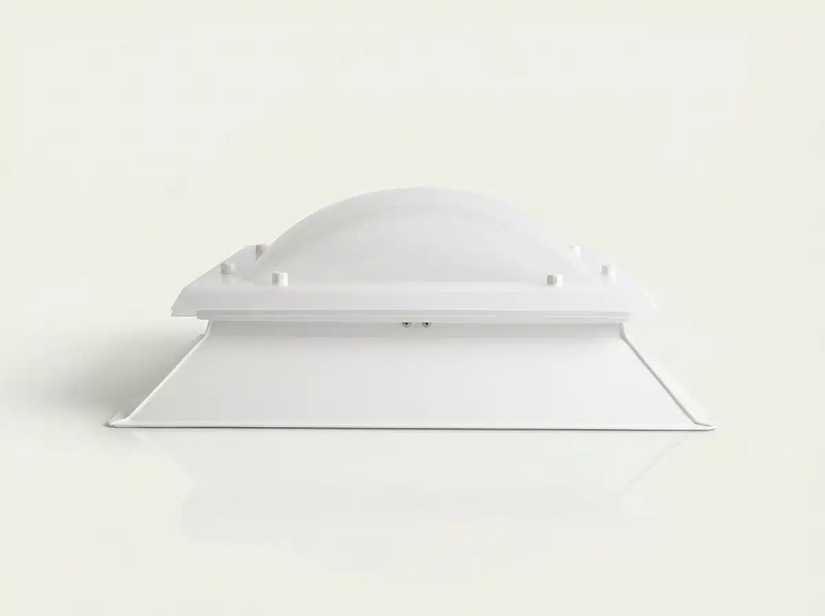 El conjunto se asienta sobre un zócalo de PVC de alta densidad con protección ultravioleta, diseñado con una pendiente de 45º para optimizar la evacuación de aguas pluviales y una superficie rugosa que favorece el aislamiento en cubierta. Dependiendo de las necesidades lumínicas, puede fabricarse en color blanco hielo para una difusión homogénea o en acabado transparente para maximizar la entrada de sol. Además, ofrece un excelente aislamiento térmico y acústico que mejora la eficiencia energética del espacio. Es una solución versátil y elegante, ideal tanto para nuevas construcciones industriales y residenciales como para la sustitución de claraboyas antiguas.